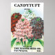 Ilustração antiga de rótulo de produto de pacote de sementes com plantas e flores de Candytuff. Cultive lindas flores mistas vermelhas, roxas, rosas e brancas no seu jardim de primavera ou em uma fazenda. Propaganda antiga para a Wayne Bash Seed Company, Fort Wayne, Indiana.