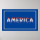 O poster Patriótico apresenta a arte "América" com texto vermelho, branco e prateado, e acrescentou um confete brilhante sobre fundo azul.
