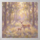 Esta pintura florestal captura um momento terno entre uma corça e seu filhote em pé silenciosamente em uma clareira iluminada pelo sol na floresta.