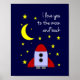 Este doce pôster de arte de parede para berçário apresenta um foguete pronto para ir à lua, junto com a frase "Eu te amo até a lua e de volta" em uma fonte branca casual sobre um fundo azul-marinho. Isso é perfeito para decorar o quarto de um bebê ou criança. Também faria um ótimo presente de chá de bebê.