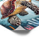 Uma ilustração em aquarela de uma tartaruga marinha nadando graciosamente debaixo d'água. A tartaruga tem um casco desgastado e está nadando através de água azul clara. Há peixes pequenos nadando perto da tartaruga. Acima da tartaruga, a frase "Fique Parado e Conheça" está escrita em letra cursiva elegante. O fundo contém coral e outras criaturas marinhas.
