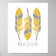 Um trio de penas estilizadas em tons terrosos de amarelo, dourado, cinza e creme, personalizado com o nome da sua criança ou qualquer texto de sua escolha.