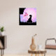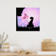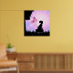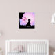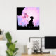 Linda silhueta de uma menina com balões cor-de-rosa e borboletas cor-de-rosa contra um fundo radiante rosa e roxo, impressão de arte de parede para escritório.