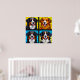 Arte vibrante de vitral representando retratos detalhados de cães alegres contra fundos coloridos, emanando positividade e calor, perfeito para celebrar animais de estimação e exposições de arte criativa.
