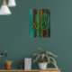 Combinação design original de fundo abstrato em turquesa e vermelho com cacto pintado manualmente em amarelos reflexivos brilhantes, verdes, vermelhos, azuis e laranja se combinam para uma arte alegre e colorida em parede.