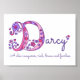 Lindo pôster com monograma da letra D, nome artístico, perfeito para o quarto ou sala de brincadeiras de uma menina, em tons de azul-marinho, branco, rosa e roxo. Personalize com o nome curto da sua filha que comece com D e o significado do nome para um toque verdadeiramente personalizado no quarto ou berçário da sua filha. Este exemplo é para o nome Darcy, "Um conquistador chique, rico, bravo e destemido". Lindo pôster ideal como presente para um novo bebê, batizado ou chá de bebê. © Desenho e design de arte gráfica exclusivo da letra D com corações e flores por Sarah Trett. www.sarahtrett.com para www.mylittleeden.com