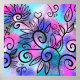 Um passarinho engraçado no canto superior esquerdo e elementos florais num fundo rosa, roxo e turquesa.