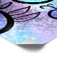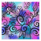 Um passarinho engraçado no canto superior esquerdo e elementos florais num fundo rosa, roxo e turquesa.
