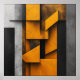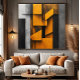 Composição abstrata com painéis geométricos sobrepostos em laranja metálico, preto e cinza concreto. Texturas industriais desgastadas criam profundidade e drama visual. Design arquitetônico moderno ideal para decoração contemporânea, escritórios ou espaços urbanos. Traga impacto visual e sofisticação industrial para o seu ambiente com esta peça artística única.