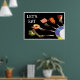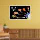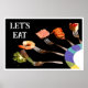 Este moderno pôster culinário foi criado a partir de uma das minhas fotografias originais. Ele apresenta uma exibição artística de alimentos suculentos equilibrados em garfos de prata Oneida, emergindo da borda de um prato de porcelana com o padrão Mikasa Currents. O texto em negrito “VAMOS COMER” no canto superior esquerdo adiciona um toque acolhedor e contemporâneo.