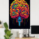Um cérebro psicodélico colorido no escuro, no estilo de ilustrações caricaturais, detalhe hiper realista, ilustrações simples e coloridas, anatomia humana, ilustrações psicológicas, linhas ousadas, cores brilhantes.