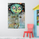 Um personagem branco com olhos grandes e irregulares e cabelos negros escrivíveis domina o primeiro plano contra um fundo semelhante a colagem cheio de texto e abstrato. Pop de laranja e vermelho na forma de espirais e círculos adicionam um toque lúdico à vibração escura e eclética geral da peça.