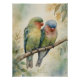 Esta pintura encantadora de aquarela apresenta um par de aves-vivas pojadas num ramo de eucalipto, cercadas por folhas verdes macios. As delicadas pinceladas e as cores harmoniosas criam uma cena romântica e serena da natureza, perfeita para amantes de aves e de arte botânica.