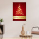 Ilustração de Natal moderna, elegante e festiva, com uma árvore de Natal feita de estrelas brilhantes sobre fundo vermelho com flocos de neve e ouro.