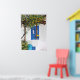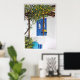 De uma pintura original em acrílicas, de Yvonne Ayoub, de um limoeiro e porta azul de uma típica casa em Skiathos, Grécia
