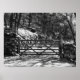 Um design fotográfico preto e branco de um passeio e portão revestidos de uma árvore.
