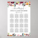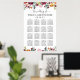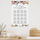 Gráfico de assentos de na moda de poster design de apresenta um monograma dos nomes da noiva e noiva e da data de casamento, texto modelo personalizado para números de mesas e nomes de hóspedes. enquadrado por uma coroa de verão e flores de aquarela de outono, incluindo rosas, dahlias, flores de peônia e verde, numa bela paleta de outono de vermelho arrojado, amarelo ouro, laranja de pêssego, rosa push, e tons de pincrugosidade de verde.