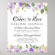 Um aviso de bar de casamento elegante... deixa seus convidados saberem que coquetéis você está oferecendo. Cheers to Love é a linha de cima. Está escrito em uma bela fonte de script. Signature Cocktails está logo abaixo em uma fonte serif clássica em todos os bonés. A noiva e o noivo escolhem os coquetéis a seguir. Flores brancas roxas e marfim criam belas bordas no topo e no fundo.