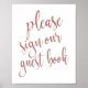Um elegante cartaz de casamento de vanguarda, mostra o texto "Por favor assine nosso livro convidado" em uma fonte extrovertida, a textura brilhante acrescenta um toque festivo e glamouroso. A cor de fundo pode ser personalizada de acordo com as suas necessidades e preferências, contacte-me se tiver alguma solicitação especial.