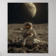 An astronaut in a white spacesuit sits on the surface of the moon. The moon's surface is gray and rocky. Above the astronaut, a large, detailed moon dominates the sky, surrounded by stars. The astronaut's helmet reflects a warm, golden light, possibly from a distant Earth. The overall mood is serene and contemplative, highlighting the vastness of space.