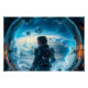 Uma ilustração digital de um astronauta vendo um planeta através da visualização de uma nave estelar.