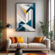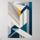 Uma arquitetura abstrata se ergue em linhas geométricas que se cruzam como arranha-céus de luz. O tom dourado irrompe pelo azul e cinza, revelando um nascer do sol simbólico que une força e delicadeza. A obra de arte transmite modernidade, esperança e dinamismo das cidades em crescimento.