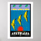 poster de viagens vintage para a Austrália que promove o recife de barreira Excelente em Queensland com três peixes tropicais e ilhas de palma.