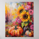 Uma pintura abstrato vibrante e moderna que mostra um arranjo lúdico de abóboras, girassóis e outras folhagens de outono. Matizes ricas do outono como laranja queimado, vermelhos profundos, pinks e amarelos ouros se misturam com pinceladas macios e tons negros de cor. O estilo abstrato adiciona um talento contemporâneo ao tema tradicional da colheita de outono, capturando o calor e a beleza da estação em uma composição artística viva.