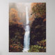 Uma bela manhã nebulosa em outubro de 2016 na majestosa Multnomah Falls. Folhas de outono coloridas e musgo verde esmagado, num filtro sonhador. Columbia River Gorge, Oregon.