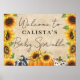 Esta bela poster apresenta três adoráveis abóboras em xadrez laranja, preta e branca, e impressão leopardo em uma impressão de burlap. Os girassóis amarelos bonito delimitam os lados do cartaz. "Bem-vindo" em uma tipografia cursiva manuscrita é apresentada no topo junto com o nome da mamãe a ser e "Baby Sprinkle" embaixo.