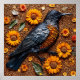 Girassóis brilhantes e sementes texturizadas criam um fundo que destaca um pássaro preto e laranja em uma composição decorativa. Essa arranjo artístico captura cores vibrantes e a beleza da natureza em uma apresentação criativa.