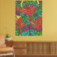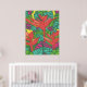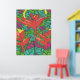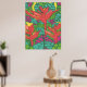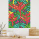 Impressão de arte tropical, fria e colorida, com folhas e pássaros do paraíso.