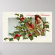 Duas belas aves vermelhas e marrons estão sentadas lado a lado num galho de sagras e bagas cobertas levemente na neve. Saudação: Um Feliz Natal. Imagem de um Cartão-postal de Natais vintages.