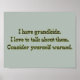 Aqui se lê: "Eu tenho netos. Eu adoro falar sobre eles. Considere-se avisado."