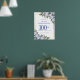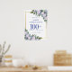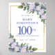 Honra uma mulher especial com este elegante e feminino 100º sinal de boas-vindas Festas de aniversário. 100º está escrito em grande texto azul. A comemoração de aniversário segue. O nome do convidado também está em letras azuis. Os detalhes da comemoração de aniversário são cercados por uma moldura de ouro chico que é decorada com rosas brancas e flores azuis. Os elementos florais estão aninhados em folhas verdes profundas.