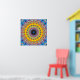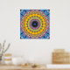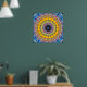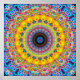 Arte de mandala azul-clara e amarela com formas caleidoscópicas redondas e padrões.