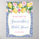 Limões de aquarelas com rosas e peônias cor-de-rosa contra um fundo de azulejo azul e branco de cobalto para este sinal de na moda ou de boas-vindas ao Chá de fraldas.
