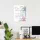 Welcome guests to your baby shower in style with this boho beach-themed sign, perfect for setting the tone for a fun and relaxed celebration. On the right side, the design features a hand-painted watercolor pink surfboard standing beside a green palm tree with sand and gentle ocean water in the background—creating a warm, coastal vibe.