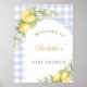 Welcome your guests in the sweetest way with this charming lemon-themed baby shower welcome poster. Featuring a soft dusty blue gingham background, fresh watercolor lemons, and delicate floral details, this design creates a warm and joyful first impression for your special celebration.