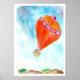 Um balão de ar quente cor de laranja brilhante, transportando 2 silhuetas. O céu é uma combinação de pinks e azuis giratórios e o chão abaixo é coberto por montanhas e uma floresta de árvores.