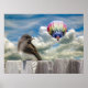Um pássaro preto com barriga branca se senta sobre uma cerca de madeira, observando um balão de ar quente no céu. As nuvens brancas e lisas num céu azul fazem um pano de fundo perfeito para o pássaro na cerca e o balão com padrão arco-íris voando.