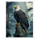 Uma águia careca empoleirada num galho resistente, seu olhar piercing fixado com foco intenso. O poderoso bico e talões afiados da águia estão claramente definidos, e as suas penas são ricamente detalhadas, mostrando o contraste impressionante entre a sua cabeça branca e o corpo escuro. Ao fundo, uma floresta nebulosa ou penhasco rochoso desaparece à distância, com árvores altas ascensões para cima, molhando a águia em seu hábitat natural. A cena exude uma atmosfera calma mas carregada, incorporando força e vigília.