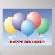 Um bando de balões de festa, um cartaz de festa de aniversário.