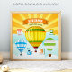 Pôster de anúncio de nascimento em sala de bebê com tipografia moderna e balões de ar coloridos em um fundo de nascer do sol brilhante. Adicione todos os seus detalhes adoráveis neste modelo fácil de usar para criar seu próprio pôster de estatísticas de nascimento único.