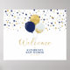 Bem-vindos a sua convidada com esta bela placa de boas-vindas ao chá de fraldas moderno. Este poster de boas-vindas apresenta tipografia na moda e balões com confetti em um tema de cor azul ouro e marinho. Condecoração perfeita para um chá de fraldas. Convites e suprimentos de festa estão disponíveis no meu compro BaraBomDesign.