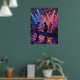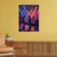 Esta pintura captura uma banda de rock and roll atuando ao vivo num palco iluminado. A trabalho de arte é caracterizada por seu pesado impacto na textura, com pinceladas grossas e expressivas que transmitem a atmosfera dinâmica e enérgica de um concerto. Dois guitarristas estão representados de forma destacada no primeiro plano, enquanto um assobio e um baterista podem ser vistos no fundo sob luzes vibrantes azuis, roxas e amarelas. A cena inteira é uma celebração da música e do espetáculo.