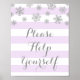 Por favor, sirva-se de bar ou mesa de sobremesa para chá de fraldas, chá de panela ou casamento com flocos de neve prateados e padrão de riscas brancas e roxas de lavanda leve.