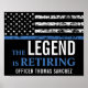 Este design apresenta uma bandeira de uma força policial com listras pretas e brancas, e também uma faixa fina azul. O texto "A Lenda está se Aposentando" fica acima do nome personalizável do oficial de lei, xerife, capitão ou chefe que está se aposentando. Celebre esse marco com estilo!