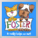 Cão e gato bonitos segurando uma faixa que diz FOSTER. Excelente para instalações de salvamento de animais para lembrar o público de promover os animais de companhia porque os ajuda. Design original de Christie Black of Creations do Coração.