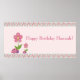 Banner de festa de aniversário com joaninhas rosa e flores. O tamanho mostrado é de 12"x24".